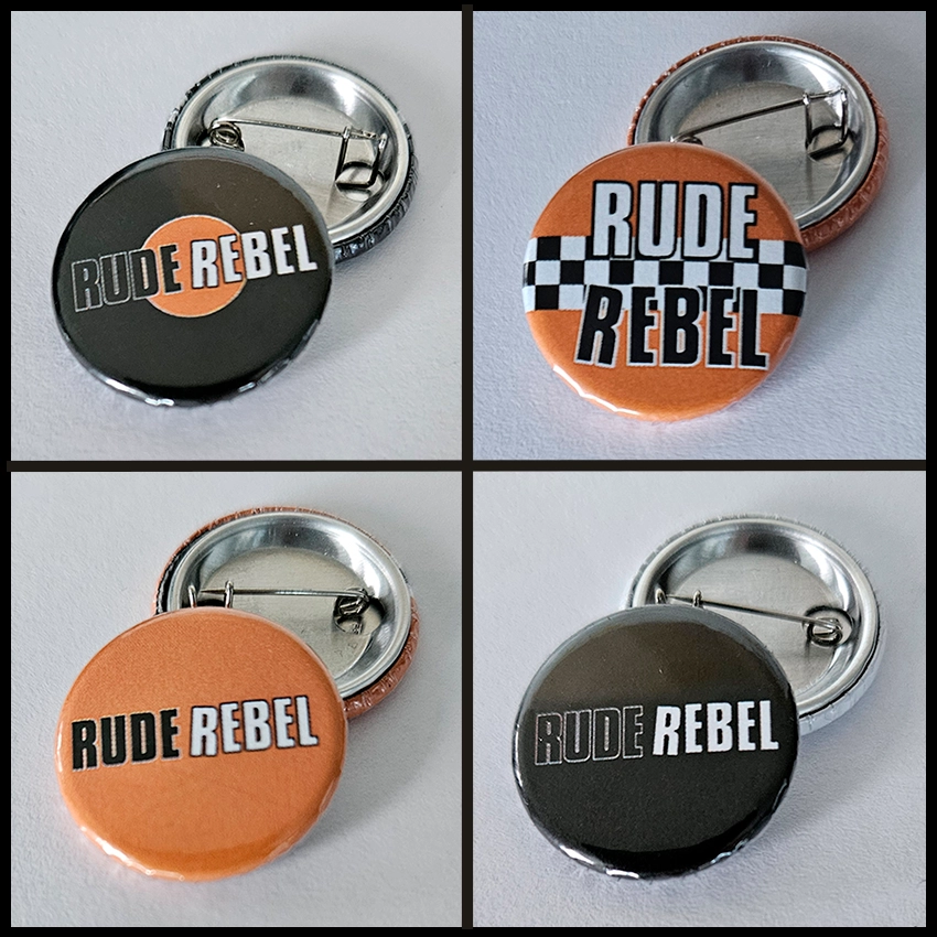 Pack of four Rude Rebel button badges.